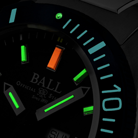 ボール ウォッチの多くのコレクションと同様、自発光マイクロ・ガスライトを備えています。このライトシステムは従来の夜光塗料と比べて約70倍も明るく、10年以上に渡って輝き続けるという、先進機能として認知されています。針と文字盤に計16個を装備。