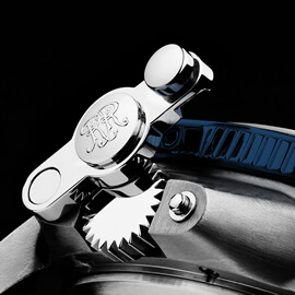 プロの着用をコンセプトとする、エンジニア・ハイドロカーボンシリーズの共通ディテールです。リューズの破損を防ぎ、ねじ込みの忘れを阻止する合理的機能といえます。プレート部には、ボール ウォッチ創業当時から使っているダブルRのロゴを刻印しています。