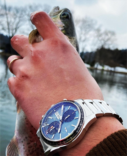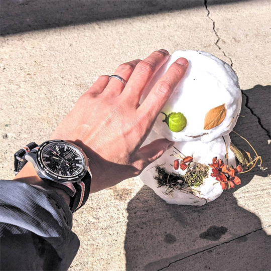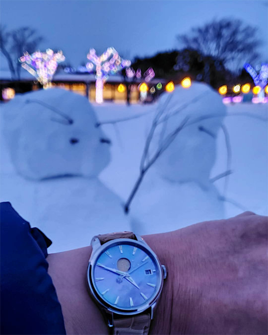 絵画のような素敵な写真を数多くインスタにアップされているyumiko.111さん。銀世界にマザーオブパール&ムーンフェイズのトレインマスターがマッチしています。バックの建物が駅舎というのも心にくい演出です!!