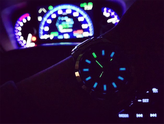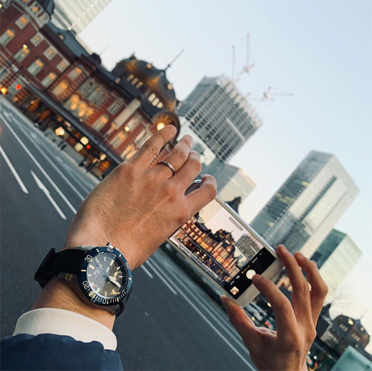明かりを灯した幻想的な東京駅を収めようとしているシーンをとらえたアイデアの一枚。ブルーPVDベゼルが爽やかな“青サブ”(サブマリン ウォーフェア)が、海辺だけでなく街中でも映えることを証明しています。