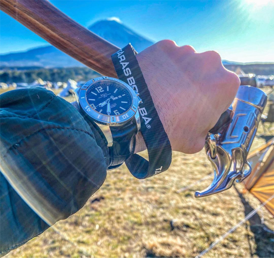 タフで防水スペックも高いスペースマスターは、まさにキャンプなどのアウトドアシーンにぴったりな腕時計! 快晴のもと稜線までくっきりと見える富士山、さらには太陽光の射し方もパーフェクトな構図と言えます (^O^)