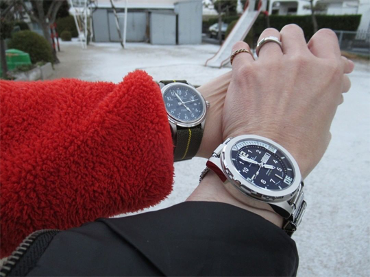 ご夫婦共通のアイテムがボールとは嬉しい限り! 鉄道時計に由来するアラビア数字が並んだ文字盤が、お二人の仲の良さを表しているかのようです。寒い日もボールを着けた手同士を繋げば、自然と温もりが感じられるはず♡