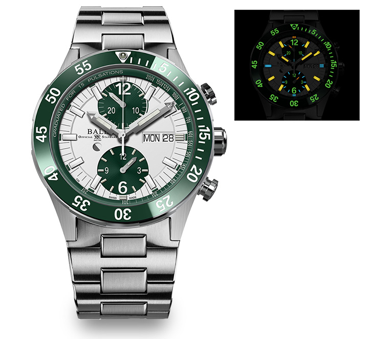 優れた精度と判読性を兼ね備え、そして難度の高い捜索・救助をサポートするために開発された「レスキュー クロノグラフ」にこの度、グリーンを基色とした新バリエーションが加わりました。クロノグラフ機能とパルスメーター・スケールを連動させることで心拍数や呼吸数を測定することが可能に。そして2つの発光サブダイヤルは最大で12時間までの経過時間を表示します。あらゆる時間帯でカウントダウンできるよう、セラミック製ダイビングベゼルの12時位置には視認性の高いマイクロ・ガスライトを組み込んでいます。バイタル機能や汎用性を兼ね備え、いざという時に頼りになるアイテムです。また、「レスキュー クロノグラフ」の中核となるのは、特殊な耐低温性オイルを使用した自動巻キャリバー、BALL RR1402です。ムーブメントは–45°C~80°Cの厳しい環境下でも安定した精度を保ちます。9時の位置の「セコンド・ディスク」インジケーターも一般的なサブ秒針を改良したもので、時計が正常に動作していることを視覚的なインパクトを凝らして知らせます。