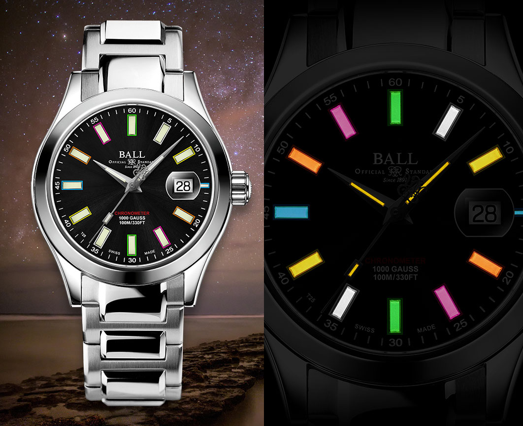 ボール ウォッチの最大の特徴は、暗闇で文字盤インデックスや針が光る「自発光マイクロガスライト」を採用していることです。昼夜を問わず、四六時中自発光しているのでボタンの操作や手首を動かす等の特別な動作をせずとも時計の文字盤面だけを確認すれば時刻を容易に読み取る事ができる利便性は皆様もご承知の通りです。通常は、12時のインデックスに「オレンジ」、そして1-11時には「イエロー」、そして針には「グリーン」に光るマイクロガスライトをセッティングするといった感じで、2-3色のマイクロガスライトを使用しておりますが、2020年12月に初めて「マーベライト」に「レインボー・エディション」が追加され注目を浴びました。「レインボー・エディション」とは、「グリーン」、「イエロー」、「ホワイト」、「ピンク」、「オレンジ」、「ブルー」の計6色の自発光のマイクロガスライトを文字盤インデックスにそれぞれ埋め込み、暗闇で「虹色」の光彩を放つ唯一無二のデザインに仕上げています。そしてこの度、「ダイバー クロノメーター」にも「レインボー・エディション」が追加され、コレクションとしては「マーベライト クロノメーター」、「ヴィクトリーMOP」と合わせて計3モデルでの展開となりました。世界的にもこのデザインは多くのお客様から現在も支持されており、今年年末に発売予定の「マーベライト36mm」など今後の新製品にもこの「レインボー・エディション」が着々と通常ラインアップされていく予定ですので、今後の展開にもご期待ください!