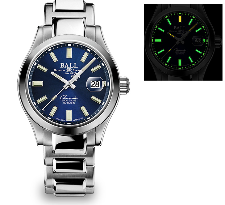 正確な時刻表示の追求は、ボール ウォッチが鉄道時計の製造をスタートした20世紀初頭から続く伝統です。文字盤中央にある「CHRONOMETER」の表記は、高精度の権威であるC.O.S.C.(スイス公式クロノメーター検定機関)による15日間の厳格な精度テストをパスした証しです。