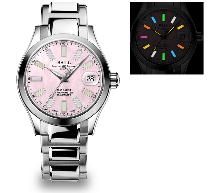 また、魅力的なのが文字盤バリエーションの豊富さで、初期ラインナップでは5カラーを展開予定です。天然素材固有の一点もののプレミアム感と煌びやかさを誇るピンク マザー・オブ・パールと、もっとも汎用性の高いブラック文字盤は、レインボー色のマイクロ・ガスライトを搭載しています。トレンドを巧みに捉えたオリーブグリーン&アイスブルー、そしてレトロシックにぴったりなグラデーションのバーガンディはそれぞれサンレイ加工を施しており、ライトグリーンとイエローで構成したマイクロ・ガスライトを備え付けています。