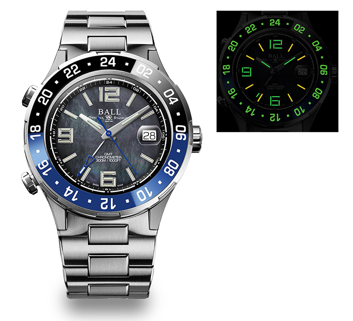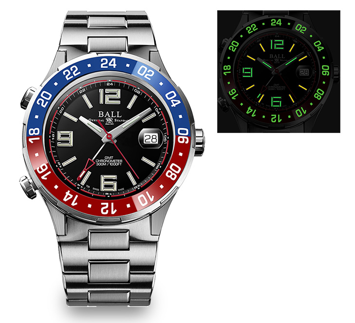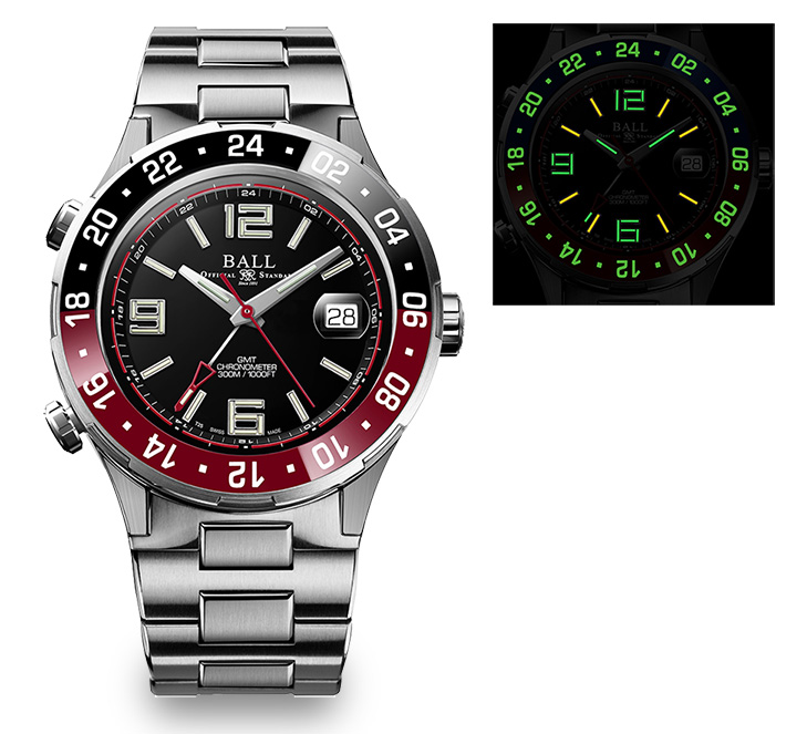 SPEC: 自動巻(BALLキャリバーRR1204-C)/GMT(第二時間帯表示)/スイスC.O.S.C.認定クロノメーター/チタン・ケース(直径40mm、厚さ14mm)/耐衝撃性(5,000Gs)/耐磁性(4,800A/m)/反射防止処理済サファイアガラス/ねじ込み式リューズ/シースルーバック/300m防水/チタンとステンレススティールのコンビネーション・ブレスレット