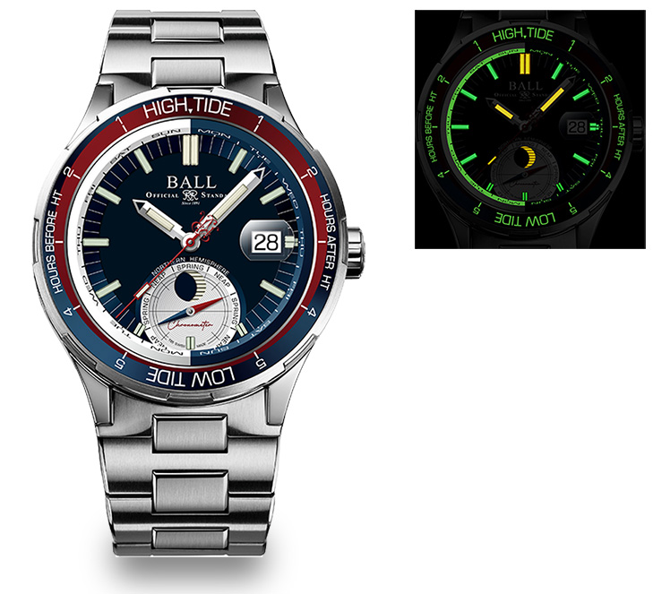 2週間分の曜日を表示したインナーベゼルと潮の干満だけを確認するためにデザインされた専用のアウター回転ベゼルを組み合わせ設定することで、当日の満潮、干潮時刻や今後2週間分のおおよその干満時刻を読み取ることが出来ます。