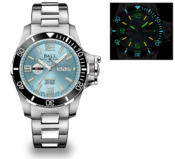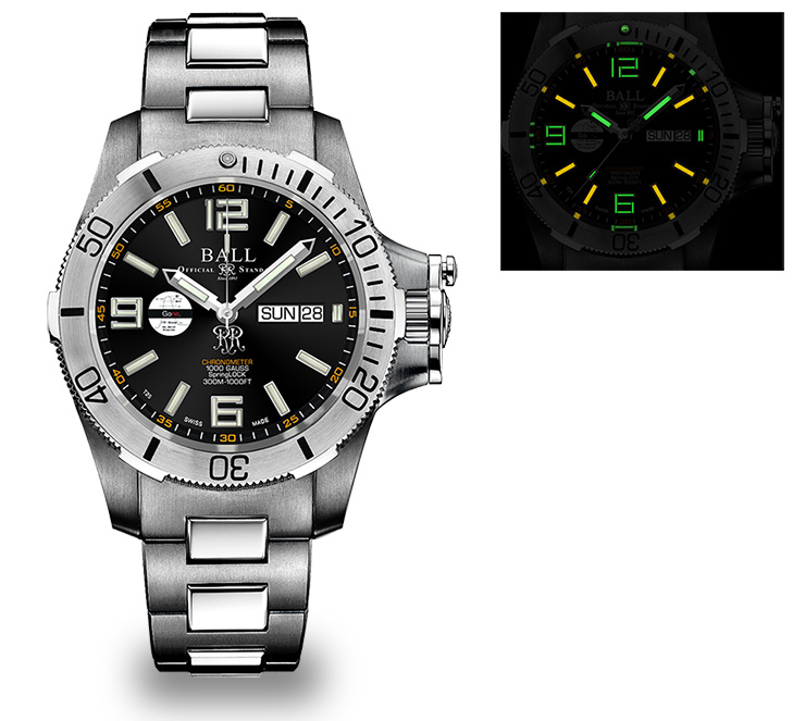SPEC:自動巻(BALLキャリバー RR1102-C)、時分秒針、日付・曜日表示、 針・文字盤に29個の自発光マイクロ・ガスライト、耐衝撃性(7,500Gs)、スプリングロック耐震システム、スプリングシール、耐磁性(80,000A/m)、ステンレススティール(316L)製ケース(ベゼル径43.2mm、厚さ16.5mm)、重さ約235g、逆回転防止機能付セラミックトップベゼル、反射防止処理済サファイアガラス、300m防水、ステンレススティール製ブレスレット、140kg重の力に耐える両側エクステンション付ステンレススティール製フォールディングバックル、世界限定500本