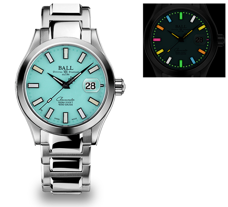 あらゆるシーンで活躍するベーシックモデル「エンジニア Ⅲ マーベライト クロノメーター」にターコイズ・ブルー文字盤の新カラーバリエーションが追加されました。「マーベライト クロノメーター」は高性能なスイス製自動巻ムーブメントを搭載、反射防止処理済みの傷に強いサファイアガラス風防、ねじ込み式のリューズやケースバックを用いた100m防水など、現代の機械式時計に求められる実用性を兼ね備えています。さらには、ケース&ブレスレットの素材に最高級のステンレススティールである「904L」を使用し、ミューメタル製インナーケースの内蔵による80,000A/m(1000ガウス)の耐磁性の獲得、そしてスイス公式クロノメーター検定機関・C.O.S.C.の認定を受けた高精度が保証されています。これ以上ない理想的なスペックを誇る3針時計「マーベライト・クロノメーター」は現在、8種の文字盤バリエーションがラインアップしていますが、さらに今回ターコイズ・ブルー文字盤を追加いたしました。