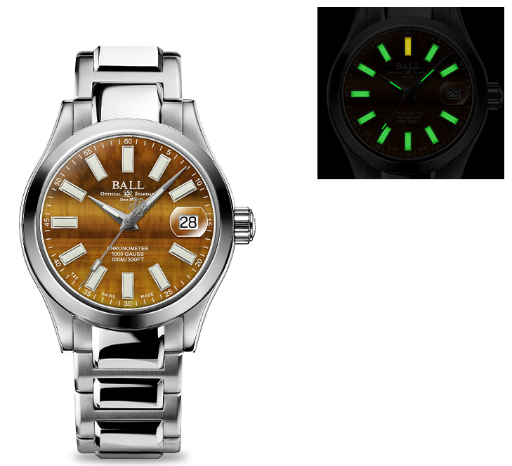 SPEC: 自動巻(BALLキャリバー RR1103-C)/スイスC.O.S.C.認定クロノメーター/日付表示/タイガーズアイ(虎目石)文字盤/針・文字盤に計14個の自発光マイクロ・ガスライト/904Lステンレススティール・ケース(直径40mm or 36mm)/反射防止処理済サファイアガラス/ねじ込み式リューズ/100m防水/耐衝撃性(5,000Gs)/耐磁性(80,000A/m)/904Lステンレススティール・ブレスレット/世界限定1000本
