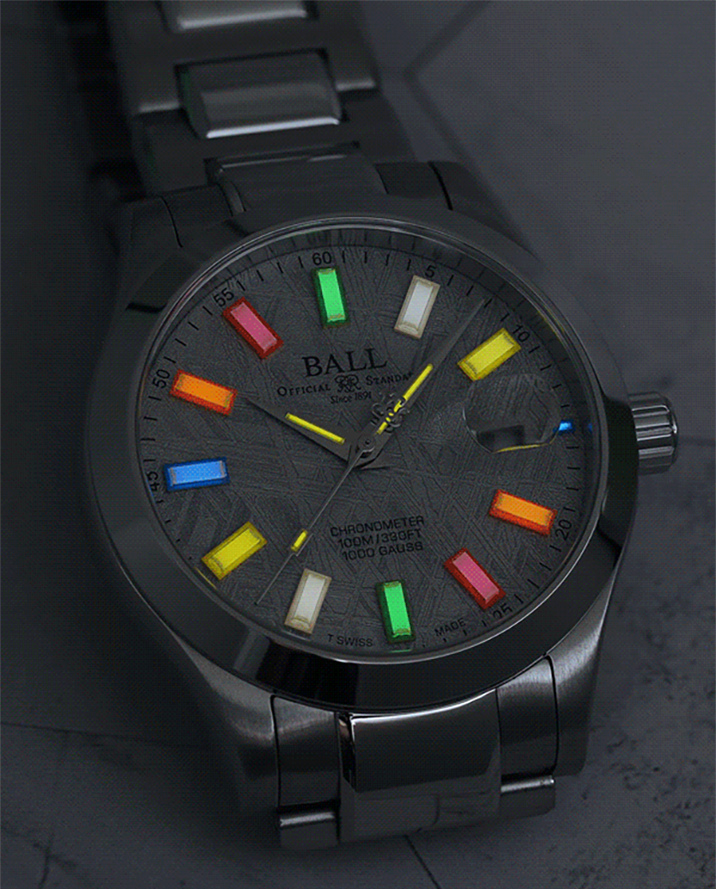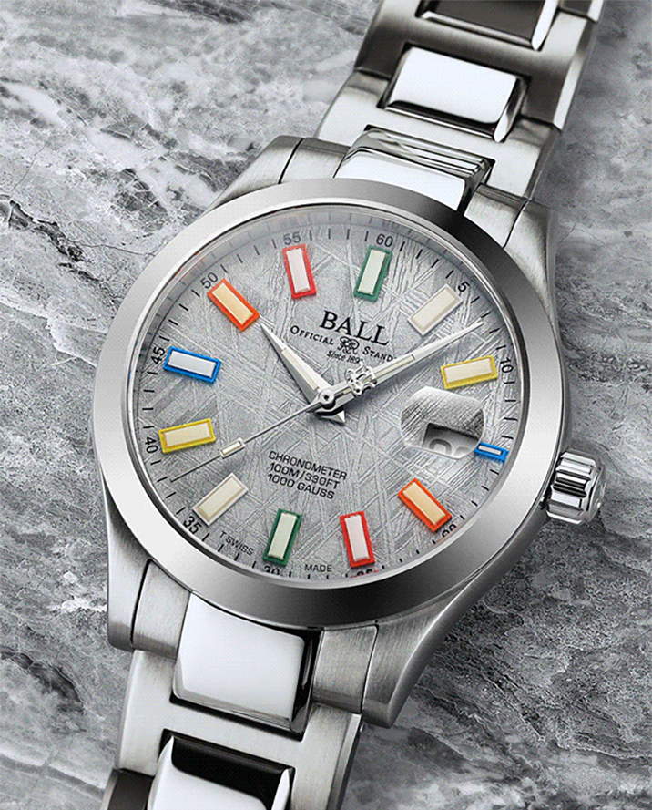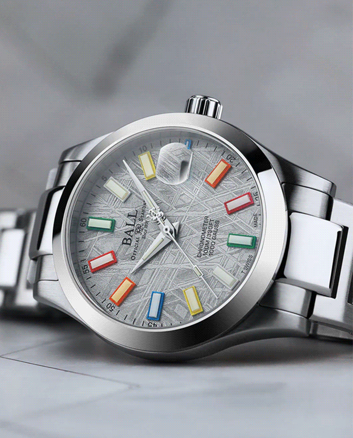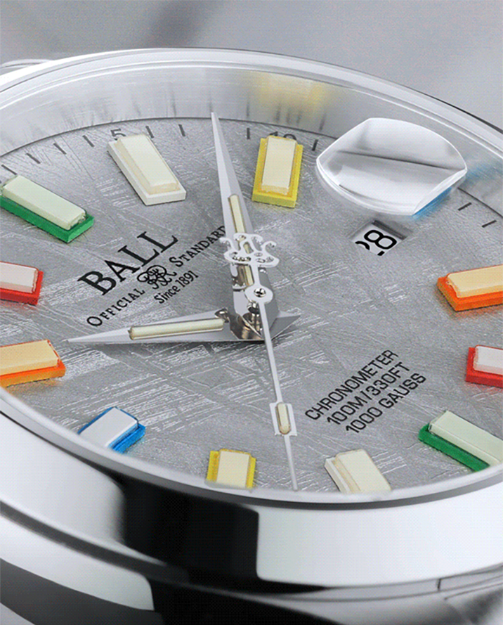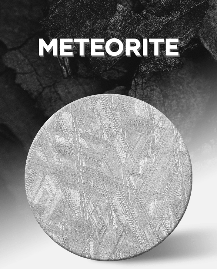 地球の近くには常時約3万7,000個の小惑星が周回しており、隕石はその一部が大気圏を通過して地表に到達したものです。私たちが採用した隕石には「ウィドマンシュテッテン構造」と呼ばれる自然に生じた幾何学的な結晶模様が見られます。これは宇宙空間で100万年以上かけて1,000年に1℃という極めて緩やかな冷却過程を経た結果、鉄とニッケルが規則正しく結晶化して生まれるもので地球上では再現不可能とされています。この模様は専門的なカットとエッチング加工を施すことで初めて可視化され、同じものが二つと存在しない、まさに宇宙が創り出した唯一無二のテクスチャとして時計の文字盤に神秘的な美しさと希少性を与えています。