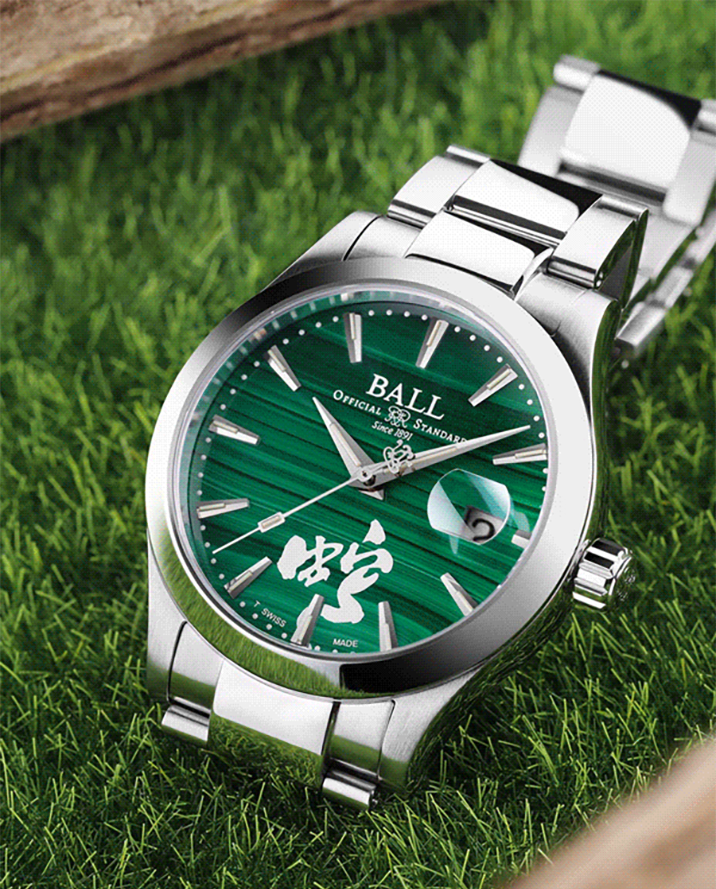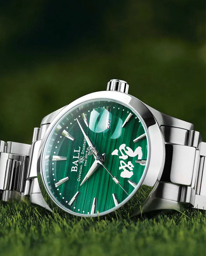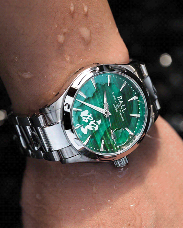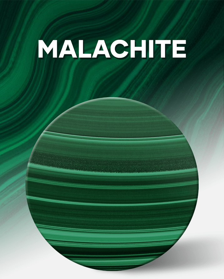ギリシャ語の“モロケ(ゼニアオイ)”に由来するマラカイト(孔雀石)は、6,000年以上にわたり幸運や魔除けの象徴とされ、古代エジプトでは護符や化粧品にも使われていました。鮮やかで深みのある緑色は銅を含む鉱物ならではのもので、「再生」や「希望」の意味を宿します。産出地や採掘環境によって模様や色調が大きく異なるため、文字盤として使用する際には縞模様のリズムと色合いの深さを厳選。天然素材ゆえに同じ模様は二つとなく、ひとつひとつが自然が生んだ芸術作品です。硬度がやや低いため加工には繊細な作業が求められ、その美しさを最大限に引き出すためには高度な研磨技術が不可欠です。