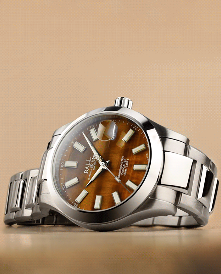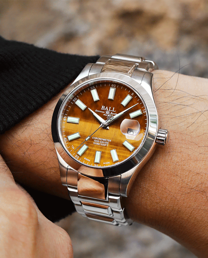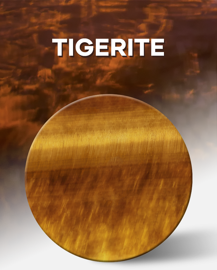 タイガーズアイ(寅目石)は古代より「すべてを見通す石」として珍重されてきた天然石で、その名の通り虎の眼光を思わせる神秘的な輝きが特徴です。光の角度によって表情を変える「シャトヤンシー(キャッツアイ効果)」と呼ばれる光彩は天然石ならではの美であり、同じ模様は二つと存在しません。当社では、色調が豊かで縞模様の流れが美しく整った高品質な原石のみを厳選し、熟練の職人による高度な研磨と加工を施すことで力強さと優美さを兼ね備えた文字盤へと昇華させています。その唯一無二の質感と存在感は時計に芸術的な深みと神秘性を与え、所有者の個性を静かに際立たせます。