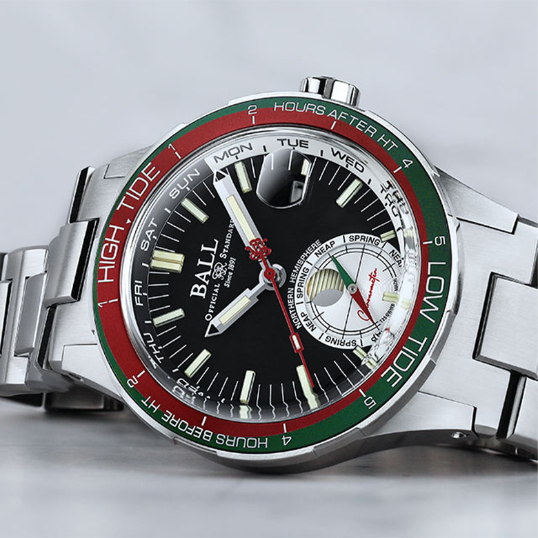 「潮汐」と「潮の強弱」表示機能を備えた機械式時計「オーシャン エクスプローラー」に、黒文字盤に緑と赤を組み合わせた鮮やかな新色ベゼルのモデルが登場。昼夜を問わず高い視認性を発揮し、冒険心あふれるデザインが印象的です。文字盤外周のインナーディスクと回転ベゼルの組み合わせにより「満潮・干潮」の時刻を、6時位置のサブダイアルで「大潮・小潮」の状態を確認でき、潮干狩りやサーフィン、釣り、セーリングなど海のアクティビティに活用可能。ムーンフェイズを含め、文字盤と針には29個の自発光マイクロ・ガスライトを搭載し、暗所でも優れた視認性を確保。自動巻きBALLキャリバーRR1803-C(スイスC.O.S.C.認定クロノメーター)を搭載し、高精度と信頼性を両立。316Lステンレススティール製ケース(41mm)、防水性能100m、世界限定1,000本。