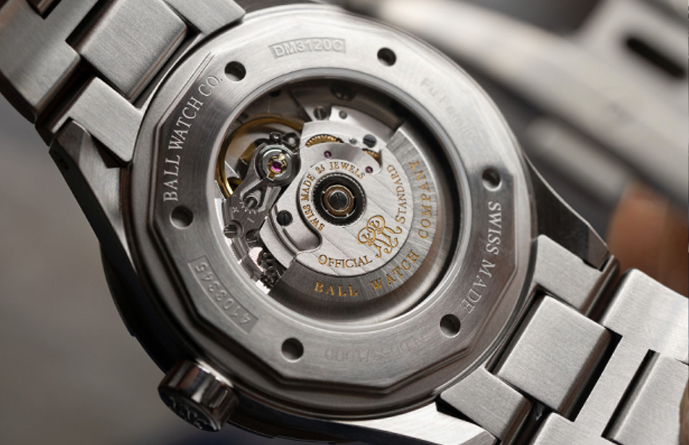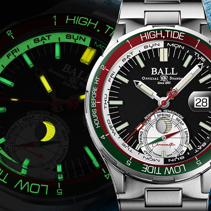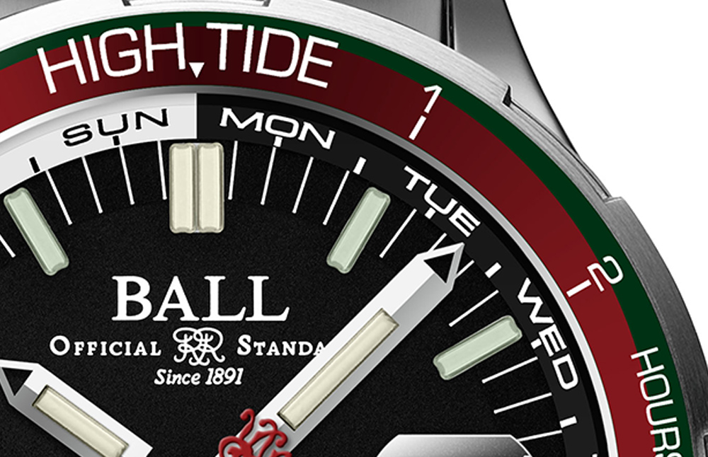 SPEC:自動巻(BALLキャリバー RR1803-C)/スイスC.O.S.C.認定クロノメーター/潮汐(満潮・干潮)表示/潮の強弱(大潮・小潮)表示/月齢(ムーンフェイズ)/日付表示/ステンレススティール(316L)ケース(ベゼル径41mm、厚さ12.9mm)/約190g/スーパールミノバ夜光付アルミニウム・トップの両方向回転ベゼル/反射防止処理済サファイアガラス/ねじ込み式リューズ/シースルーバック/ステンレススティー製ブレスレット/ステンレススティー製フォールディングバックル/100m防水/耐衝撃性(5,000Gs)/耐磁性(4,800A/m)/世界限定1000本