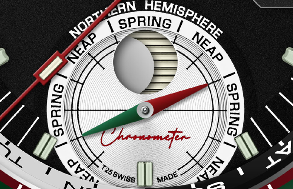 文字盤6時位置のサブダイアルが、北半球での大潮(Spring)・小潮(Neap)の状態を表示。干満差が最も大きい大潮から最も穏やかな小潮まで、約2週間の潮の周期を確認できます。この画像では、針が「Spring」と「Neap」の中間を指しているので、現在が「中潮」の状態であることを示しています。