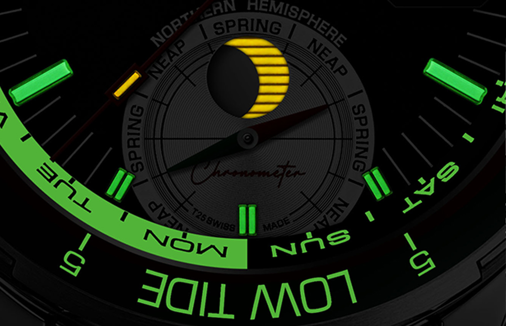 夜明け前の海は静寂に包まれ、潮の音だけが響く。その中で「オーシャン エクスプローラー」は確かな光を放つ。暗闇に浮かび上がる自発光マイクロ・ガスライトが、視認性を確保しながら時を刻み、同時に月齢(ムーンフェイズ)の姿までも美しく照らし出す。月と潮、そして時間——自然のリズムを腕元で感じられる瞬間だ。「干潮・満潮」や「大潮・小潮」を表示するメカニカル・コンパスを搭載し、潮の動きを読み取ることができるこのモデルは、夜釣りやクルージング、サーフィンなど、海と共にある時間をより深く、確実に支えてくれる。高い防水性能と耐衝撃構造により、過酷な環境下でも揺るがない信頼性を発揮。暗闇の中で静かに輝く光は、まるで航路を導く灯台のようにあなたを導く。自然と調和し、月と潮の呼吸を読むためのタイムピース——それが「オーシャン エクスプローラー」。未知の海への冒険心をいっそう刺激します。