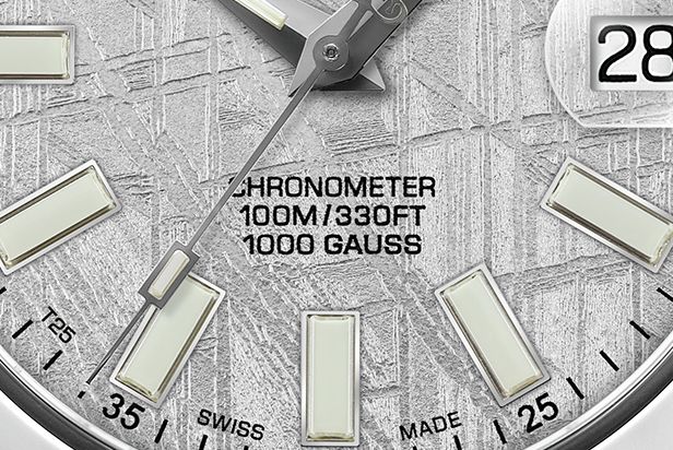 「マーベライト クロノメーター 36 メテオライト」の文字盤には、独特な幾何学模様が特徴である「ムオニオナルスタ隕石」=「メテオライト」を採用。「ウィドマンシュテッテン構造」と呼ばれる神秘的な網目模様の結晶は地球上では再現することは不可能と言われ、生成するのに最低でも100万年はかかるとされています。この模様は宇宙における最も美しいテクスチャの一つとして広く知られています。そして地球外物質であることから希少性も高く、さらに模様も同じものがないため一点もののプレミアム感が満載です。