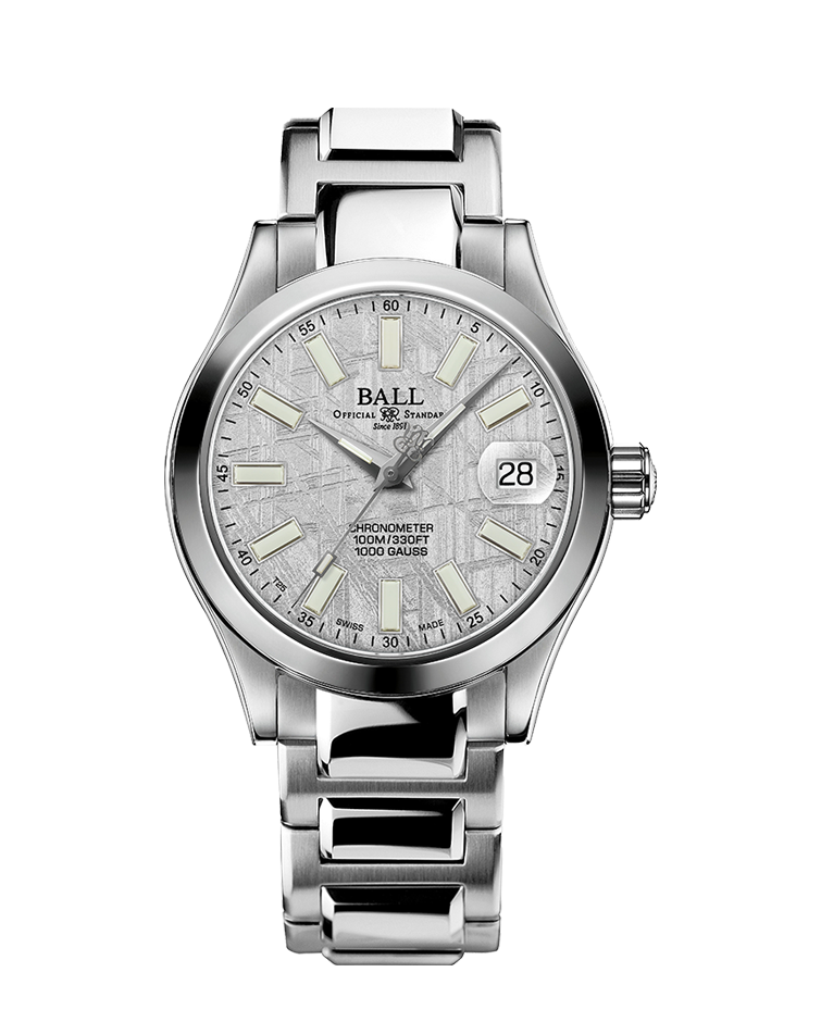 人気モデル「マーベライト クロノメーター」に、ケースサイズ36mmの新モデルが登場。文字盤には地球上には存在しない希少な天体物質「ムオニオナルスタ隕石」を採用。1906年に北極圏近くのスウェーデンとフィンランド国境付近で発見されたこの隕石は、地球最古級の歴史的価値を持ち、独自の模様が一点ごとに異なるため、唯一無二のプレミアム感を楽しめます。コンパクトながら存在感あるデザインで、特別な腕元を演出します。もちろん、ボール ウォッチを代表するモデル「マーベライト クロノメーター」ですから、文字盤と針には自発光のマイクロ・ガスライトを搭載し、スイスC.O.S.C.認定クロノメーター仕様のムーブメント、最高級の904L ステンレススティール製ケース、ミューメタル製インナーケースによる80,000A/mの耐磁性能、さらに5,000Gsの耐衝撃性を備え、「シビアな環境でこそ必要とされる機能性」を有しています。世界限定1000本。