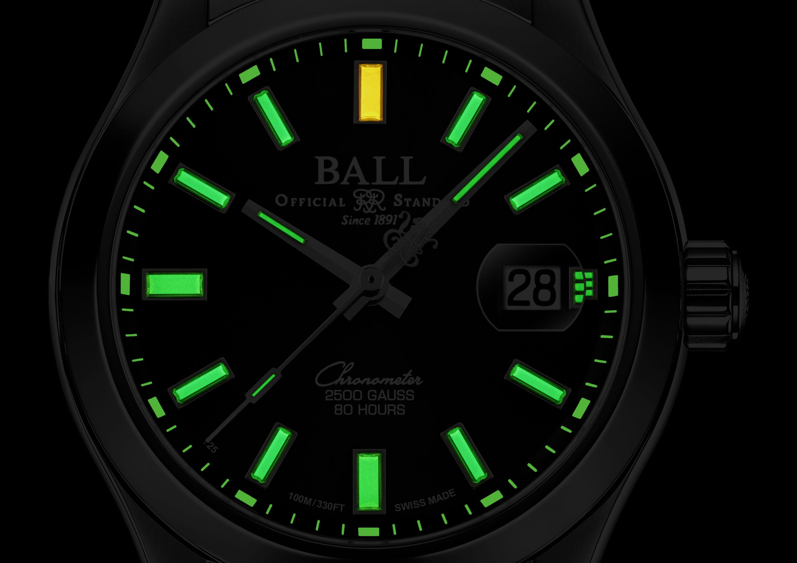 80時間駆動を誇る当社初の 自社製ムーブメントに、シリコン製ヒゲゼンマイとUV-LIGAプロセスで成形したガンギ車、アンクルにアップグレードしたことで、シースルーバックにもかかわらず2,500ガウス(約200,000A/m)の耐磁性能を実現。このムーブメントはスイスC.O.S.C.認定クロノメーターの検査にも合格しており、さらに当社が独自に定めたBALLオフィシャル スタンダードという同検定以上の基準値「日差−2秒〜+4秒内」の精度を保証します。さらに、ケース&ブレスレットの素材には最高級ステンレススティール904Lを採用しており、究極的な実用性を備える次世代モデルとして開発されました。