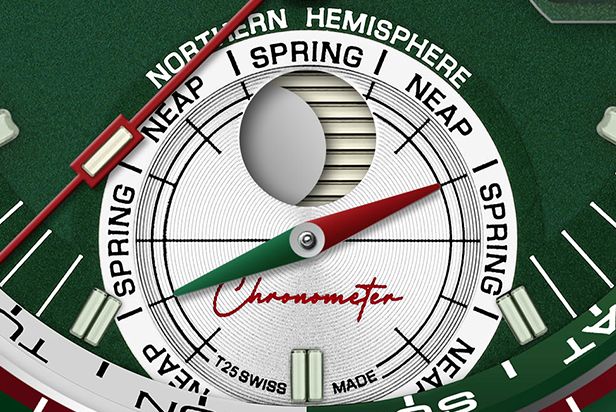 潮の満ち引きは、月と太陽、そして地球の自転が生み出す重力の相互作用によって起こります。船乗りや海洋学者、海を愛する探検者にとって、その変化は航海や活動に大きな影響を及ぼします。「満潮」と「干潮」は1日にそれぞれ2回発生し、一定の周期で繰り返されます。オーシャン エクスプローラーは、2週間分の曜日を表示するインナーベゼルと、潮の干満を確認するために設計された専用アウターベゼルを組み合わせることで、当日の満潮・干潮時刻や、今後2週間分のおおよその潮のリズムを読み取ることができます。この画像は、「月曜日の満潮が12時24分」「火曜日が13時15分」「水曜日が14時6分」に訪れることを示しています。