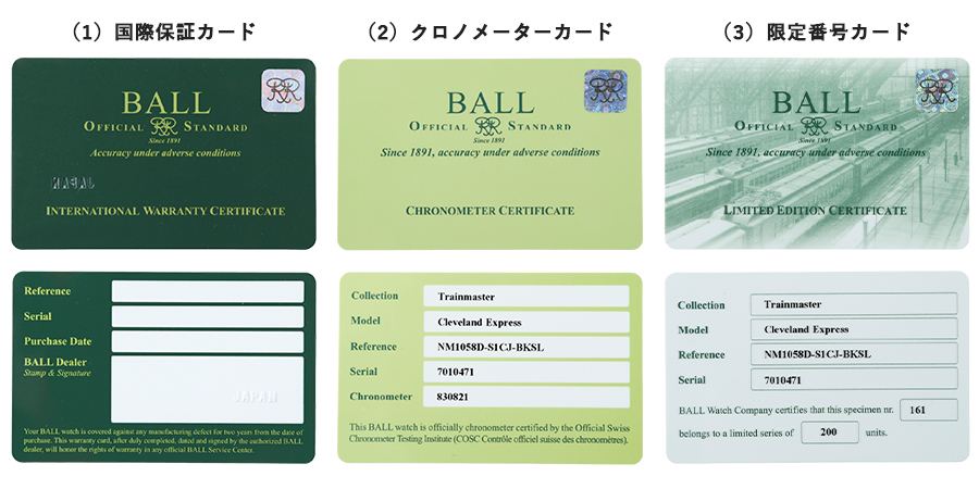 例えば、エンジニアハイドロカーボン シルバーフォックス(数量限定モデル)をご購入の場合、国際保証カード、クロノメーターカード、限定番号カードの3枚がお客様のお手元に届きます。
